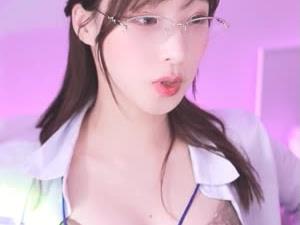 - 명아츄 흰 셔츠를 풀어헤친 안경 오피스걸 레이스 브라 가슴골