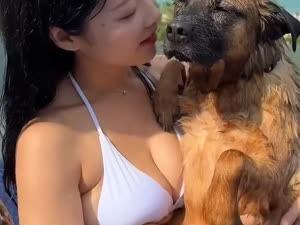 - 강아지와 함께 수영장에서 개조이 주인 흰 비키니 가슴골