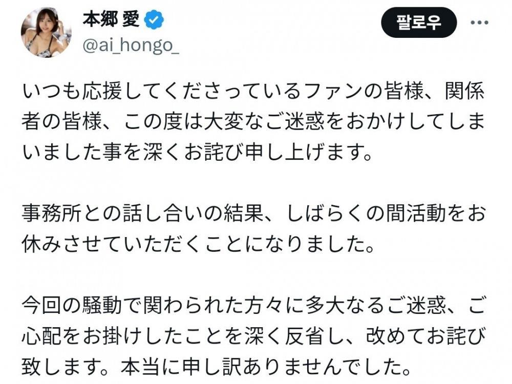 - '스트리머 불륜 사태' AV 배우 혼고 아이 근황